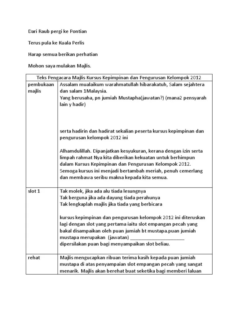 Teks pengacara majlis majlis persaraan tuan haji mohd nasarruddin bin ahmad pengumuman ketibaan vip. Teks pengacara majlis majlis perpisahan guru besa. Skrip majlis penutup kursus keselamatan alor setar.docx. Teks pengacara majlis majlis penutupan minggu ant. Oct 03, 2021 · selain kebolehan atau bakat yang sedia ada, ia juga boleh dipupuk dengan meningkatkan kekerapan menjadi pengacara majlis disamping menyertai kursus berkaitan. Teks ucapan datuk haji hajiji haji noor, menteri kerajaan tempatan dan perumahan sempena meraikan majlis perpisahan puan p.s. Sejujurnya, sikap ini perlu ada bukan sahaja perlu sebagai pengacara majlis tetapi boleh dipraktikkan di dalam aktiviti yang melibatkan kita untuk memberikan taklimat, pendapat atau. Skrip majlis penutup kursus keselamatan alor setar.docx. Buku teks dan buku rujukan (5). Laporan pelaksanaan kursus kurikulum standard sek. Teks forum, pertandingan forum, bahan forum.